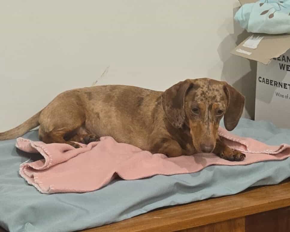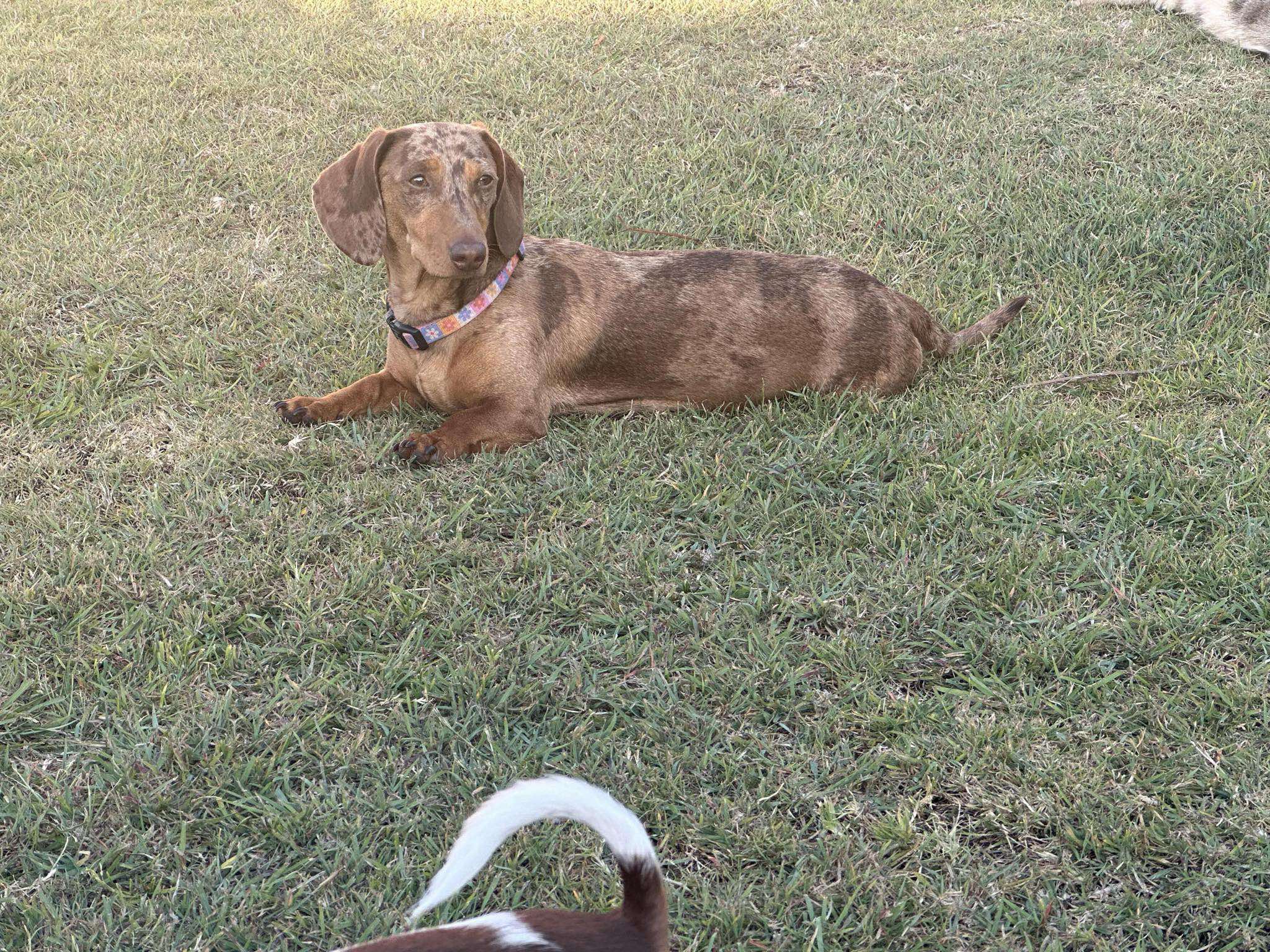 Female miniature smooth tan dapple Dachshund
