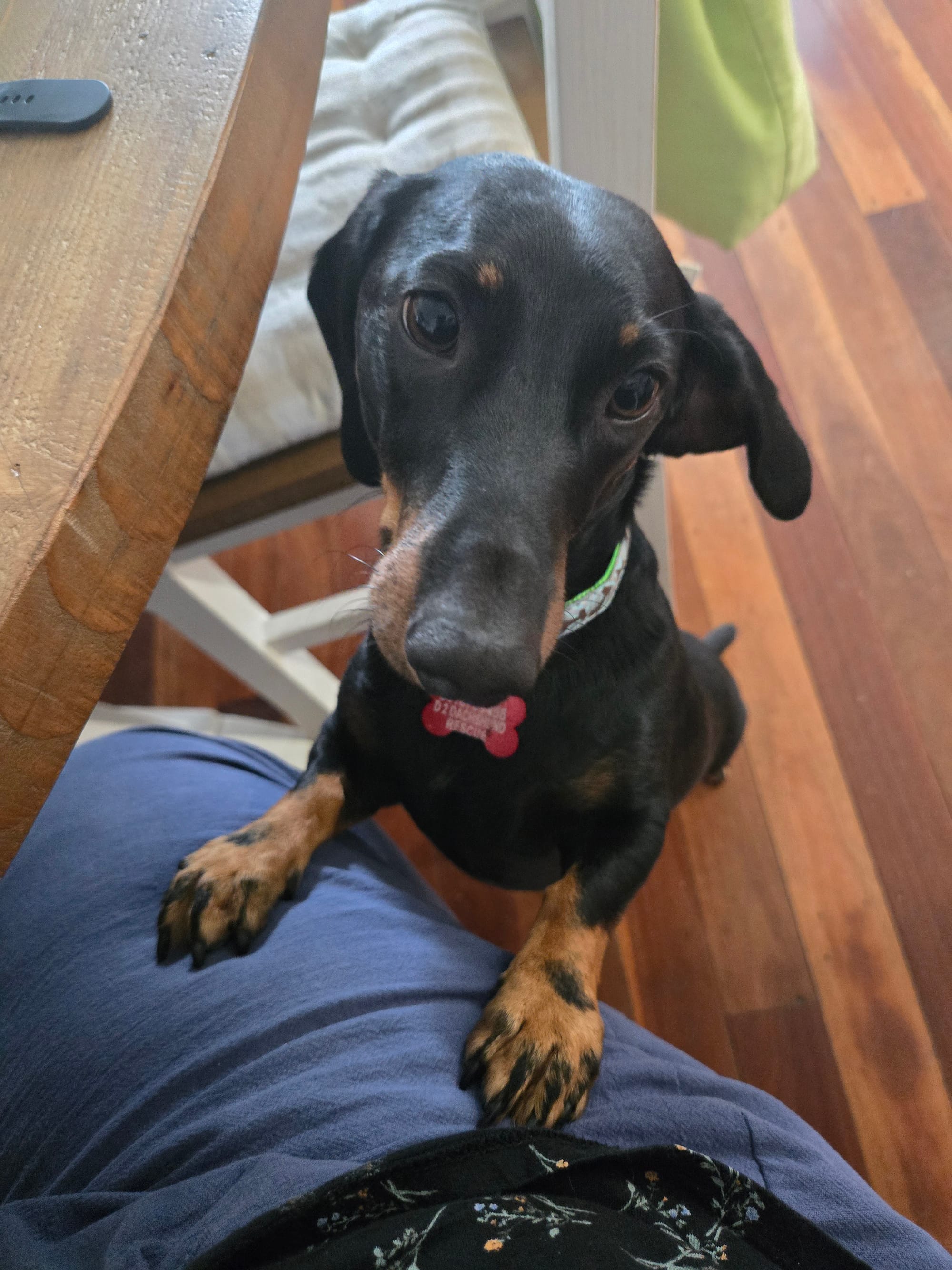I am an 8kg smooth-haired boy with tan and black colouring.