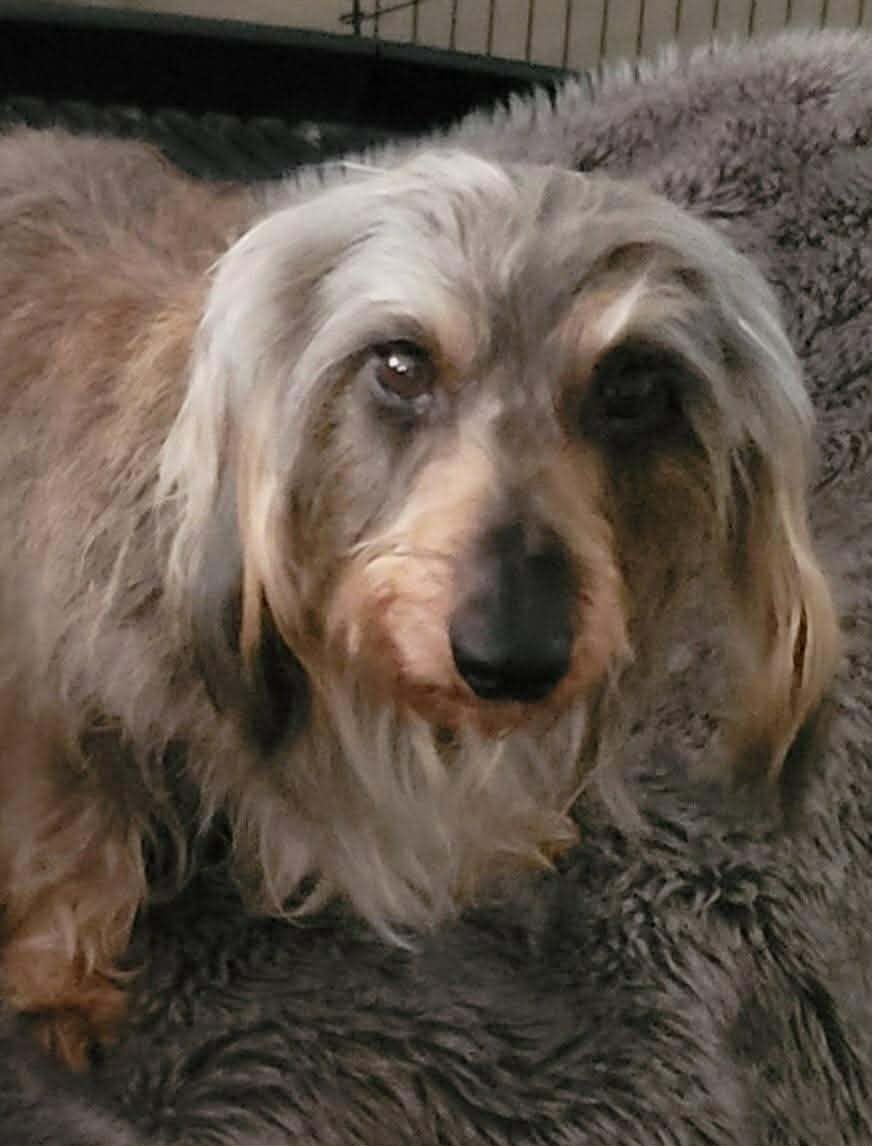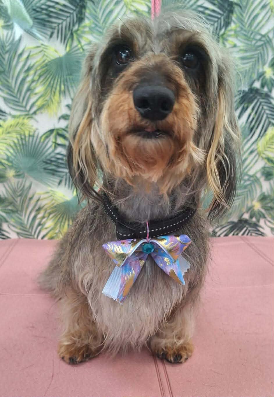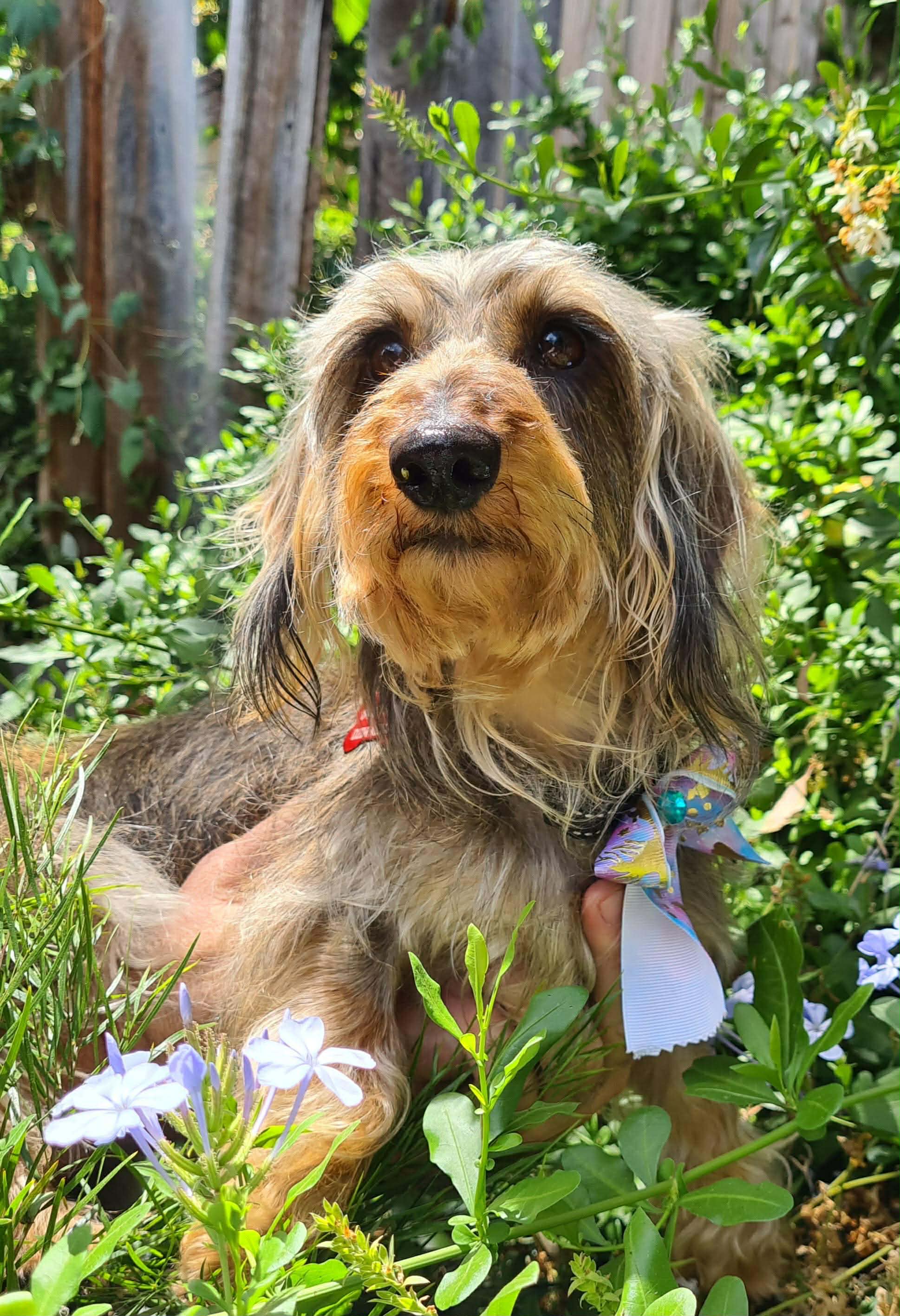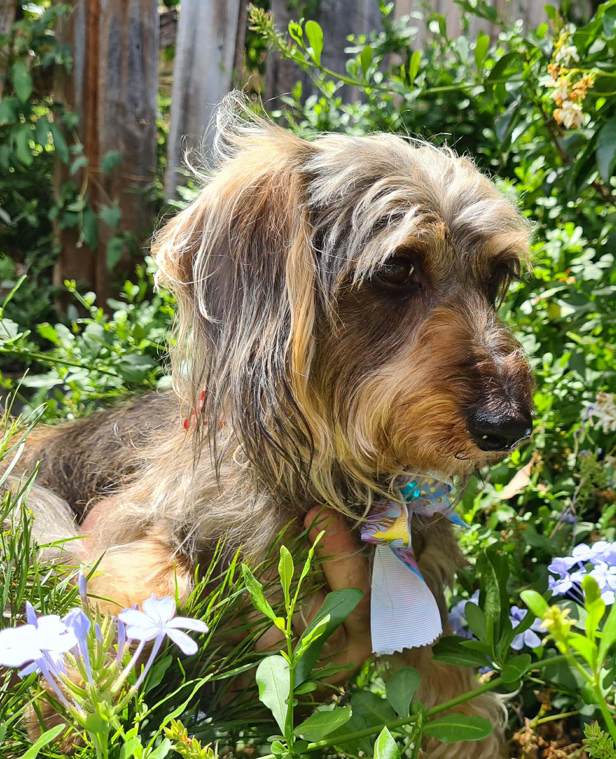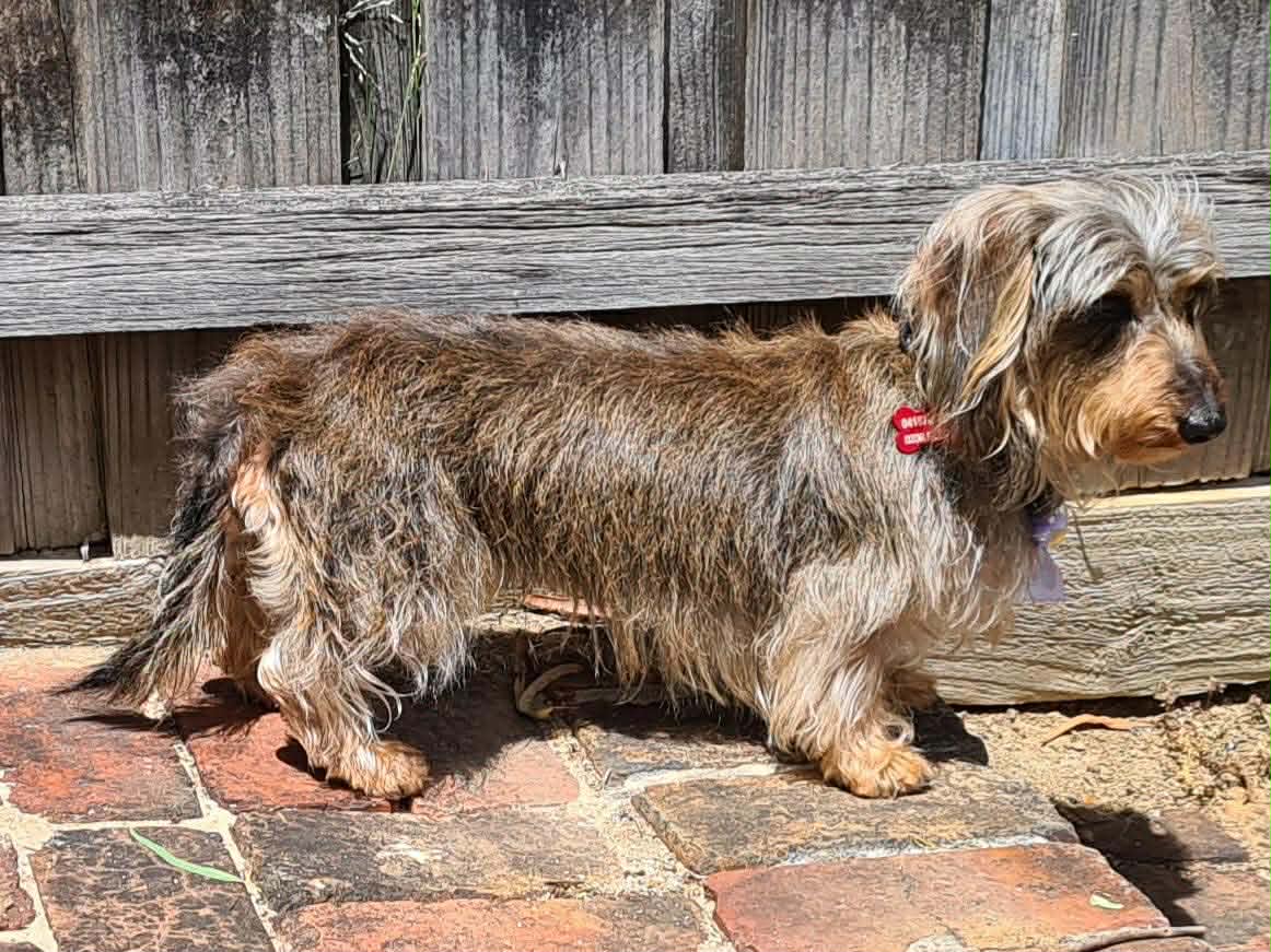 Violet is a beautiful, wild boar coloured, silky wire-haired dachshund. She is a sweet, loving and cuddly girl who adores being with her favourite humans. In true dachshund style she loves to hunt lizards in the backyard and protect the house from birds. She is crazy for car trips and walks too, making her a fantastic cafe dog.